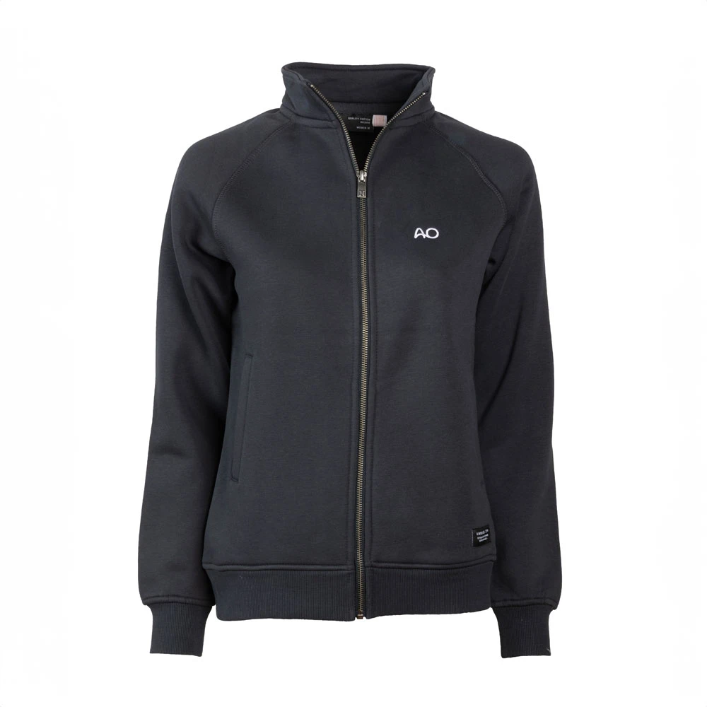 Full zip cardigan with a stand-up collar, long sleeves, brushed fleece lining, with short shave treatment, metal main zipper, tone in tone jersey tape around the zip tape, 2 classic front pockets.