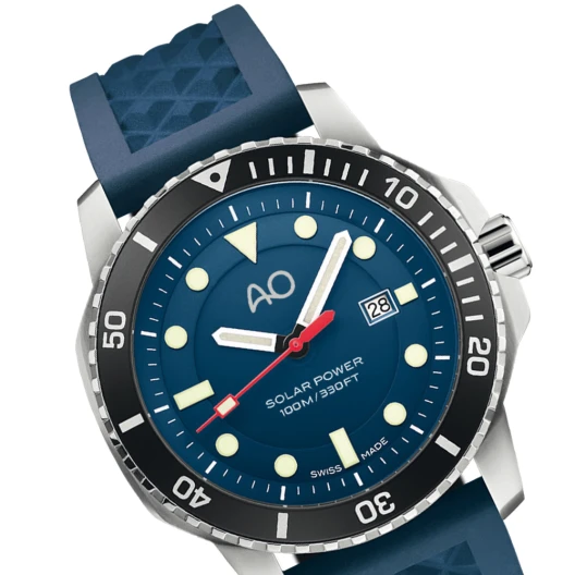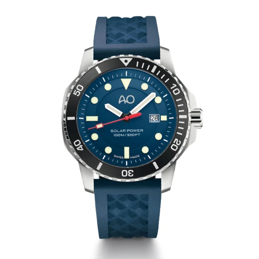 Men's watch, 3-hand, solar-powered, Ronda 215 Solar movement, sapphire crystal, silver stainless steel case, blue dial with indexes, blue rubber strap, water resistance: 10 ATM/100 m